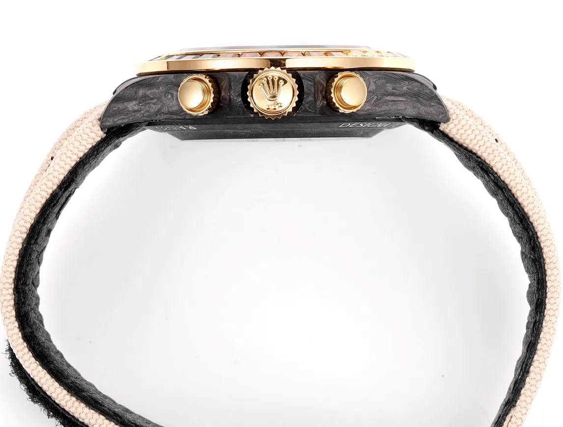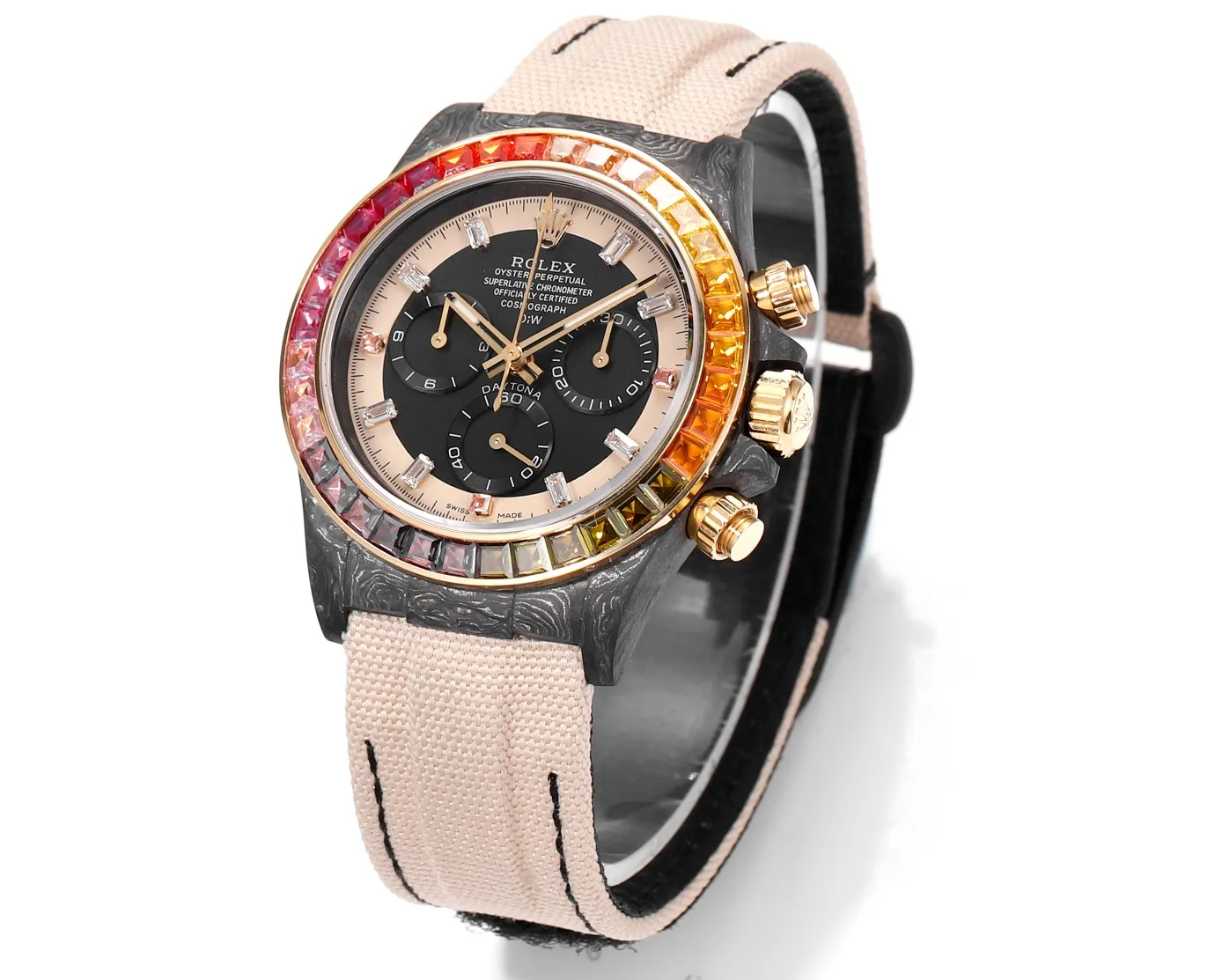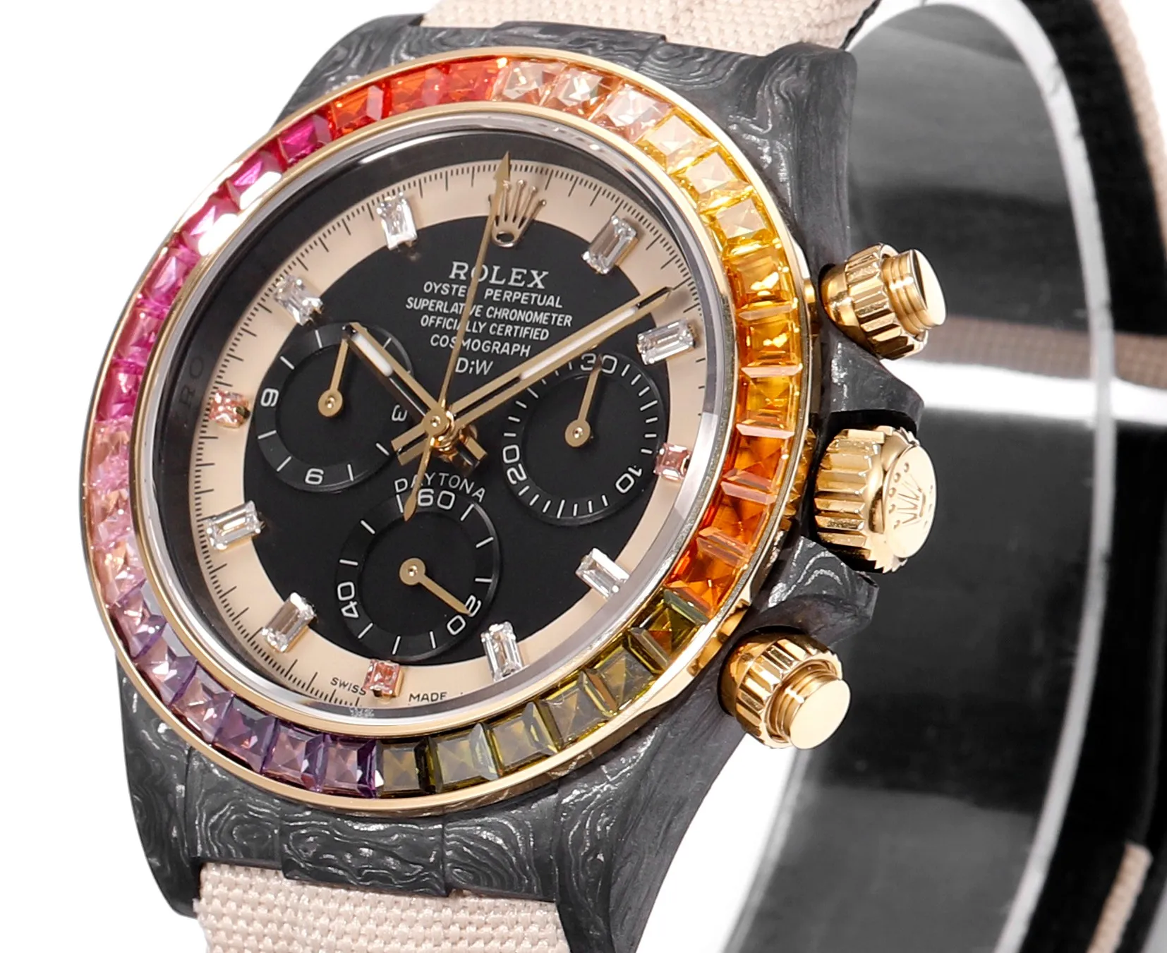 Customized Carbon Fiber Case This case is constructed of carbon fibre and offers a lightweight, durable construction. Each watch has a different carbon fiber pattern. Case and clasp are enhanced with elements that glow in the dark to provide visibility, even when it is dim. Rainbow Bezel – This bezel has a gemstone rainbow pattern that gives the watch an elegant and colorful touch. The beige strap is soft, flexible and comforting. This high-quality 4801 movement is known for its precision and reliability. This Rolex Cosmograph Daytona combines innovation with luxury. The watch has a custom-made carbon fibre case in beige with night glow elements. This watch is a unique piece, embodying the essence of a. This is the epitome of fine craftsmanship.