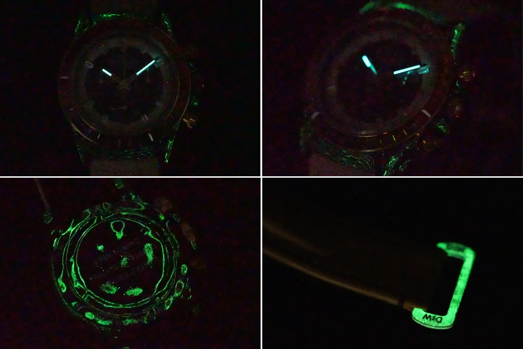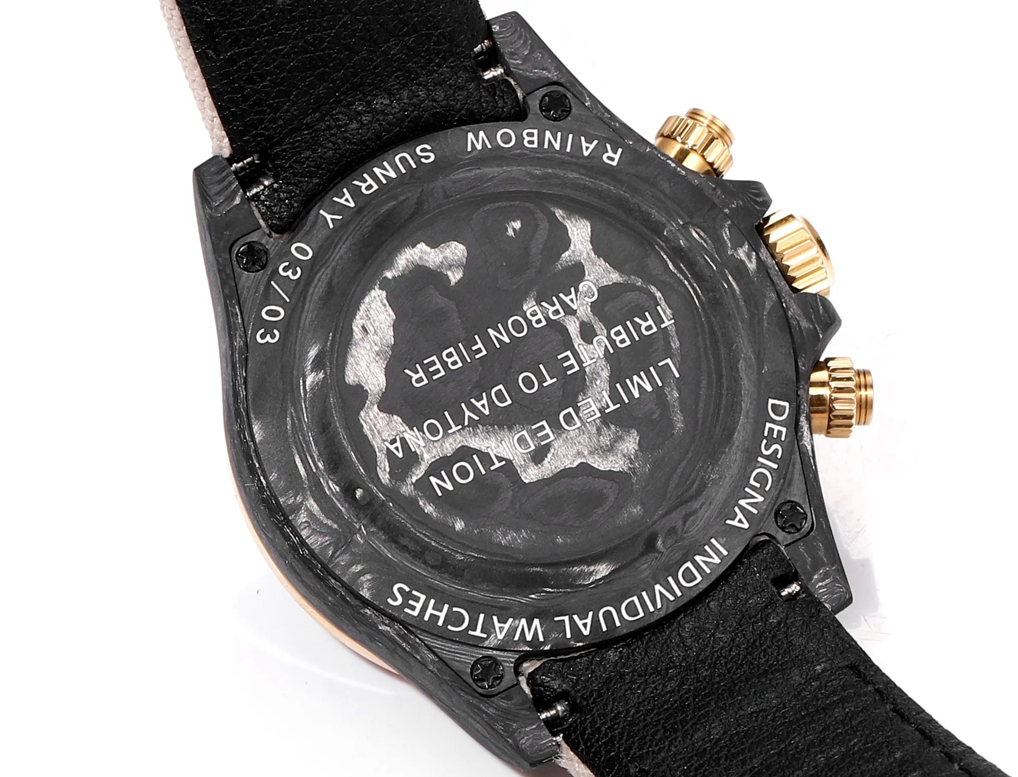 Rolex Daytona Custom Carbon Fiber Night Glow Case Watch – Black with Rainbow Bezel, Beige Strap