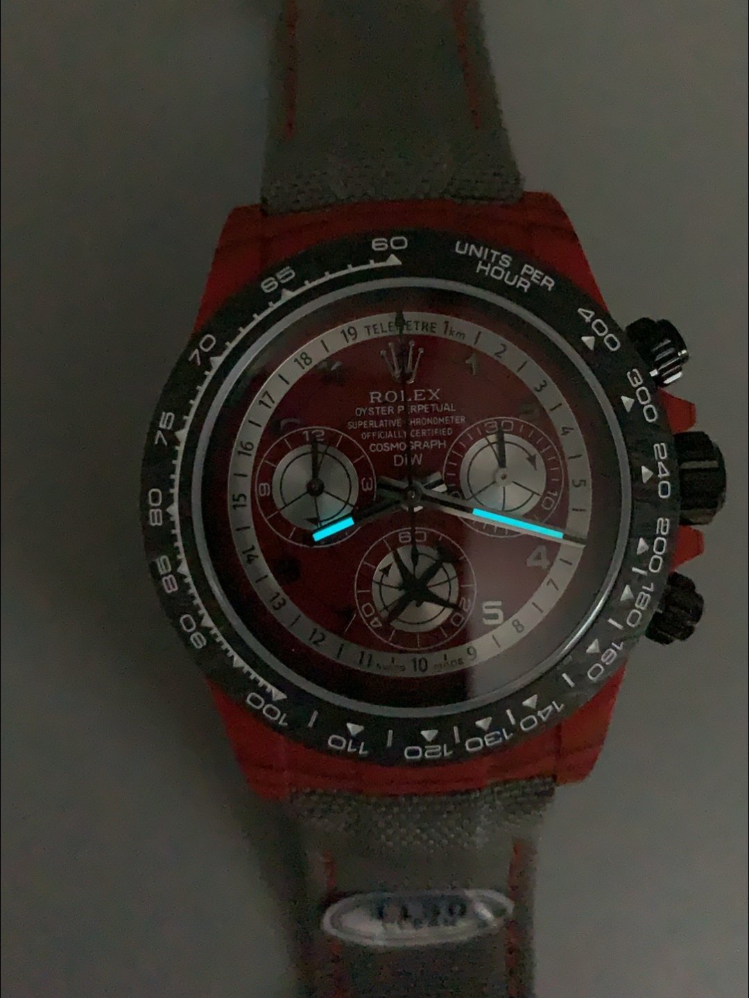 Rolex Daytona Edition Watch in Red Dial Red Carbon Casing () — Premium 1:1 super clone. Case: 904L stainless steel case and bracelet. Crystal: Genuine sapphire crystal with AR coating. Movement: Clone Cal. 3235 (28,800 bph, 70hr power reserve, date). Price: $1,650. 12-month movement warranty. Free worldwide shipping on orders over $1,200.