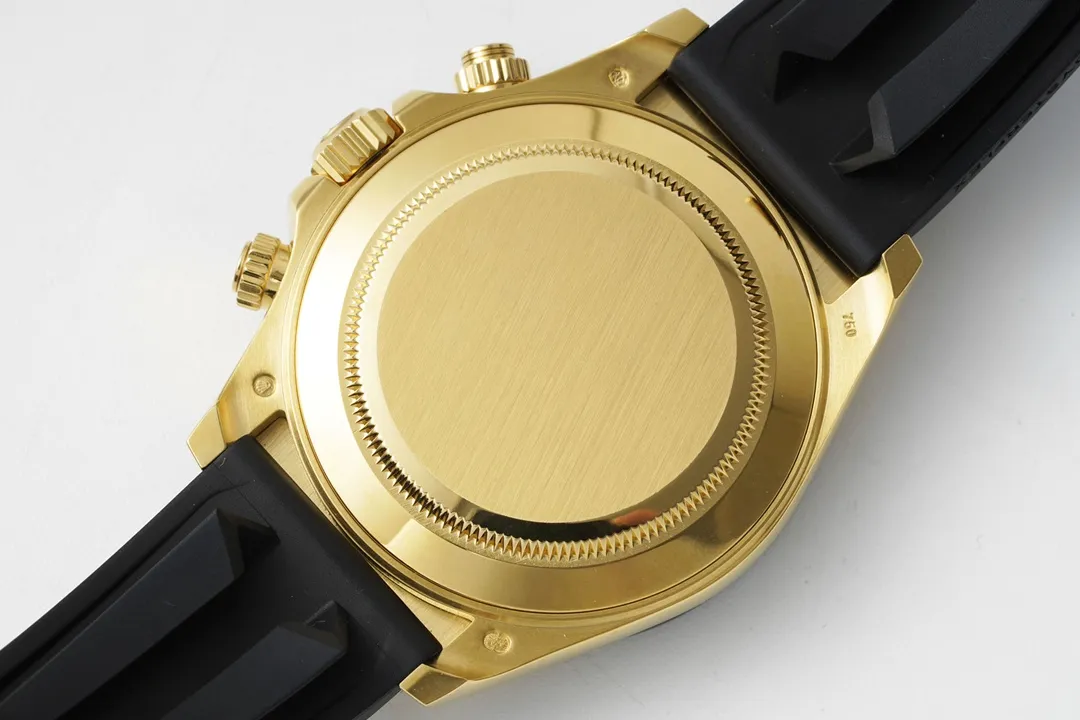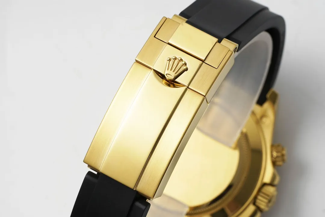 The KING ROLEX Cosmograph Daytona features a black rubber strap and a gold-plated case. This high-quality combines superior functionality with meticulous craftsmanship, offering an elegant and precise blend.
