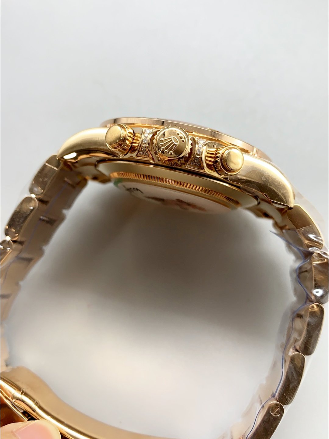 Rolex Daytona 4130 Gold Full Gold Chronograph Watch – Swiss A-Grade Watches Quality — Premium 1:1 super clone. Case: 904L stainless steel case and bracelet. Crystal: Genuine sapphire crystal with AR coating. Movement: Clone Cal. 4130 (column-wheel flyback chronograph). Price: $859. 12-month movement warranty. Free worldwide shipping on orders over $1,200.