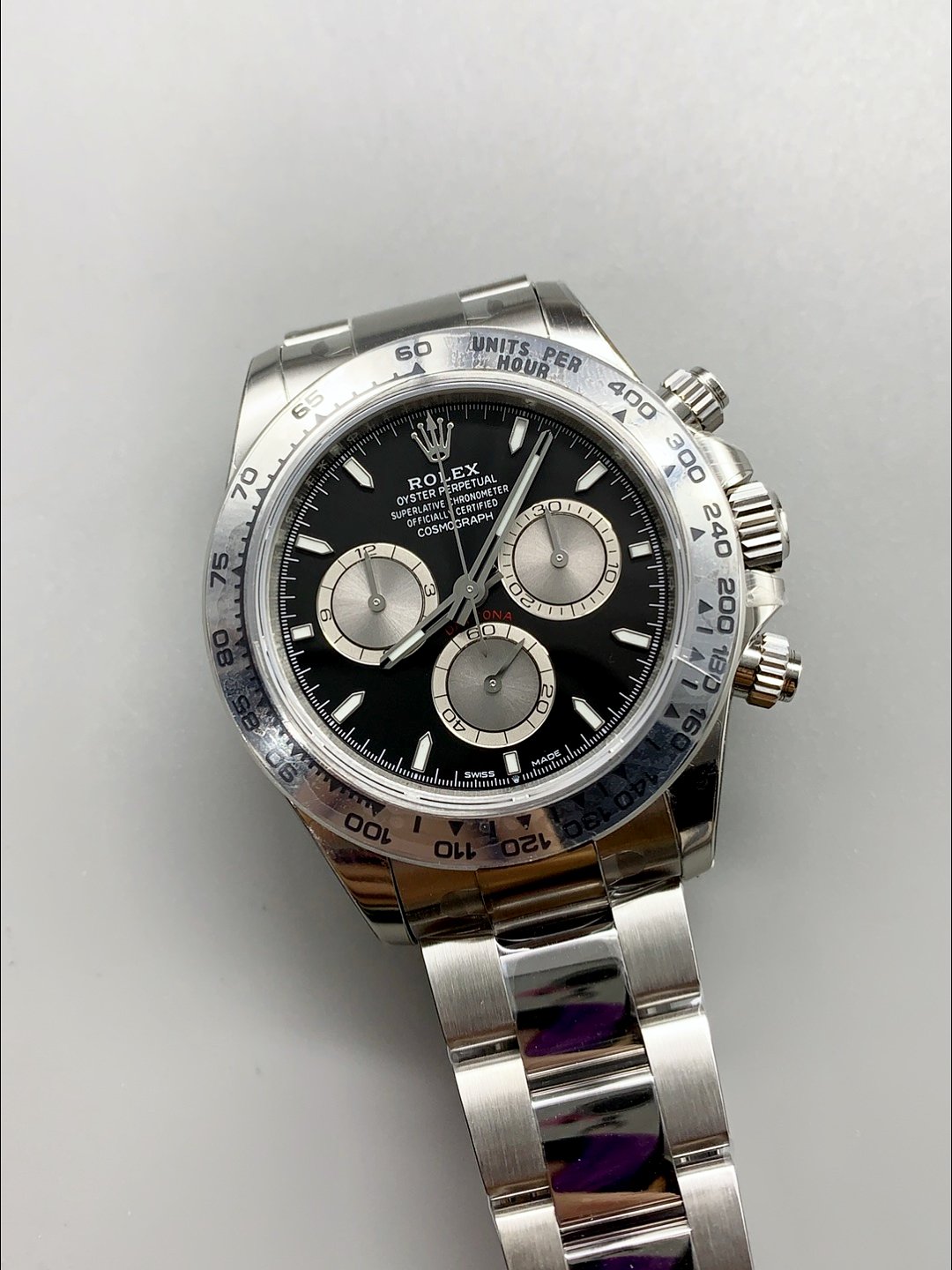 Rolex Daytona M126500LN Perfect Edition – Silver Stainless Steel, Black Dial, Watches Chronograph — Premium 1:1 super clone. Case: 904L stainless steel case and bracelet. Crystal: Genuine sapphire crystal with AR coating. Movement: Clone Cal. 4130 (column-wheel flyback chronograph). Price: $859. 12-month movement warranty. Free worldwide shipping on orders over $1,200.