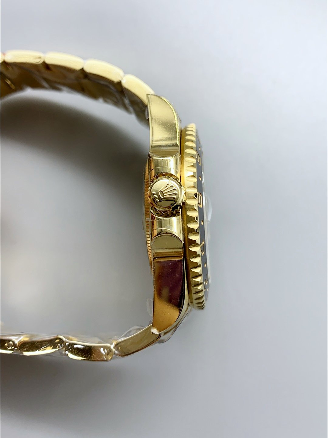 Rolex GMT-Master II 116718LN 18K Gold Wrapped — Premium 1:1 super clone. Case: 904L stainless steel case and bracelet. Crystal: Genuine sapphire crystal with AR coating. Movement: Clone Cal. 3235 (28,800 bph, 70hr power reserve, date). Price: $1,650. 12-month movement warranty. Free worldwide shipping on orders over $1,200.