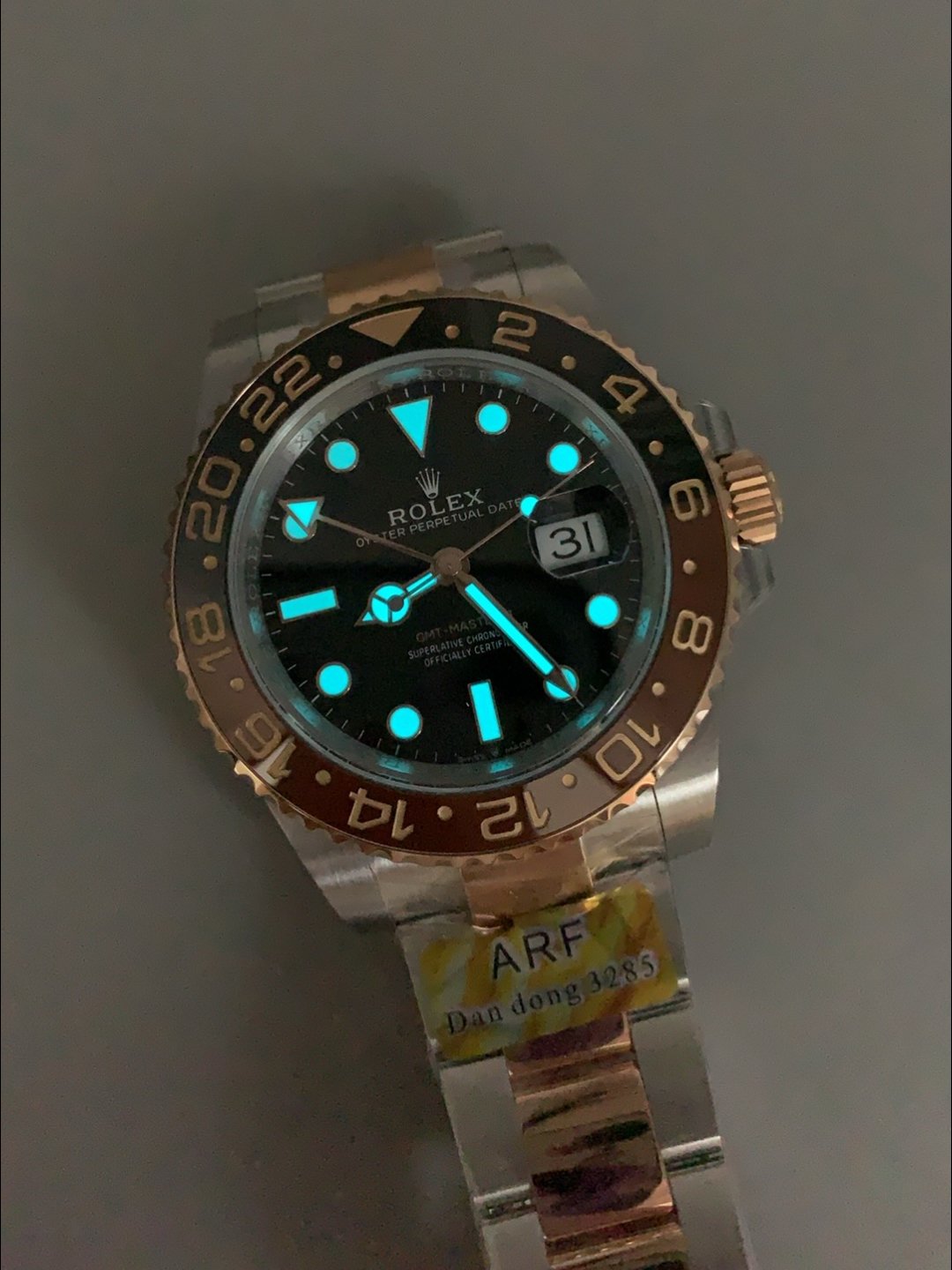 The New Rolex GMT-Master II in Rose Gold.() — Premium 1:1 super clone. Case: 904L stainless steel case and bracelet.. Crystal: Genuine sapphire crystal with AR coating.. Movement: Clone Cal. 3235 (28,800 bph, 70hr power reserve, date).. Price: $1650. 12-month movement warranty. Free worldwide shipping on orders over $1,200.
