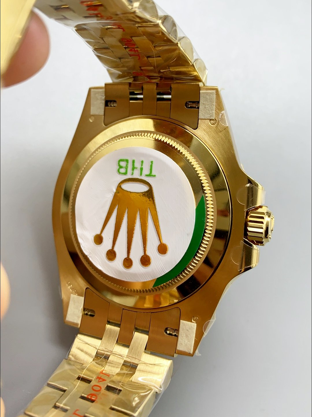 Rolex GMT-Master II 116718LN 18K Gold Wrapped — Premium 1:1 super clone. Case: 904L stainless steel case and bracelet. Crystal: Genuine sapphire crystal with AR coating. Movement: Clone Cal. 3235 (28,800 bph, 70hr power reserve, date). Price: $1,650. 12-month movement warranty. Free worldwide shipping on orders over $1,200.