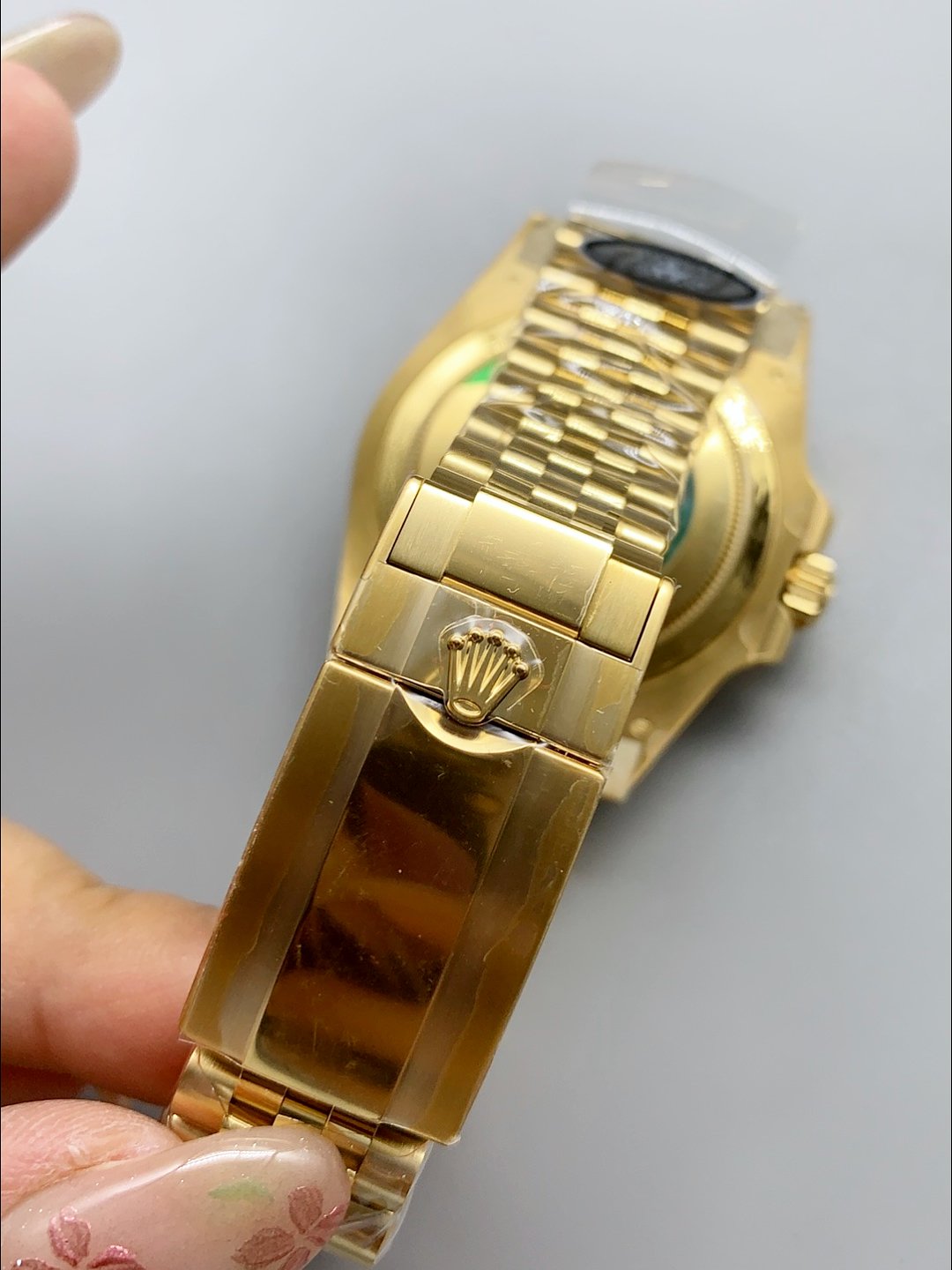 Rolex GMT-Master II 116718LN 18K Gold Wrapped — Premium 1:1 super clone. Case: 904L stainless steel case and bracelet. Crystal: Genuine sapphire crystal with AR coating. Movement: Clone Cal. 3235 (28,800 bph, 70hr power reserve, date). Price: $1,650. 12-month movement warranty. Free worldwide shipping on orders over $1,200.