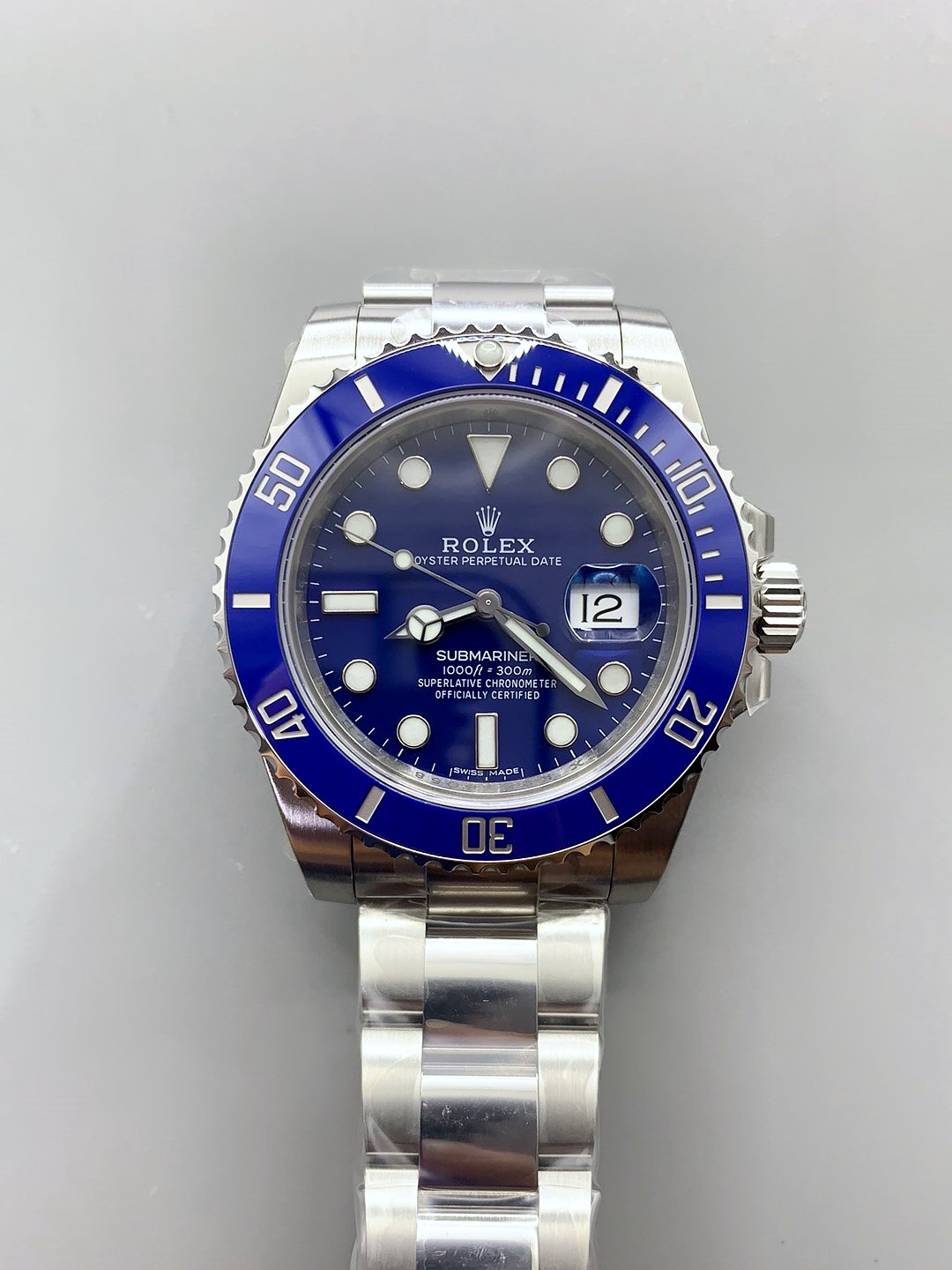 Rolex Submariner Bluesy 126613LB — Premium 1:1 super clone. Case: 904L stainless steel case and bracelet. Crystal: Genuine sapphire crystal with AR coating. Movement: Clone Cal. 3235 (28,800 bph, 70hr power reserve, date). Price: $1,650. 12-month movement warranty. Free worldwide shipping on orders over $1,200.