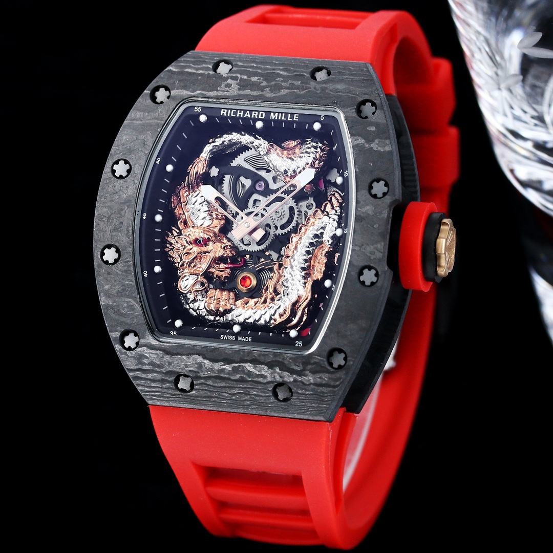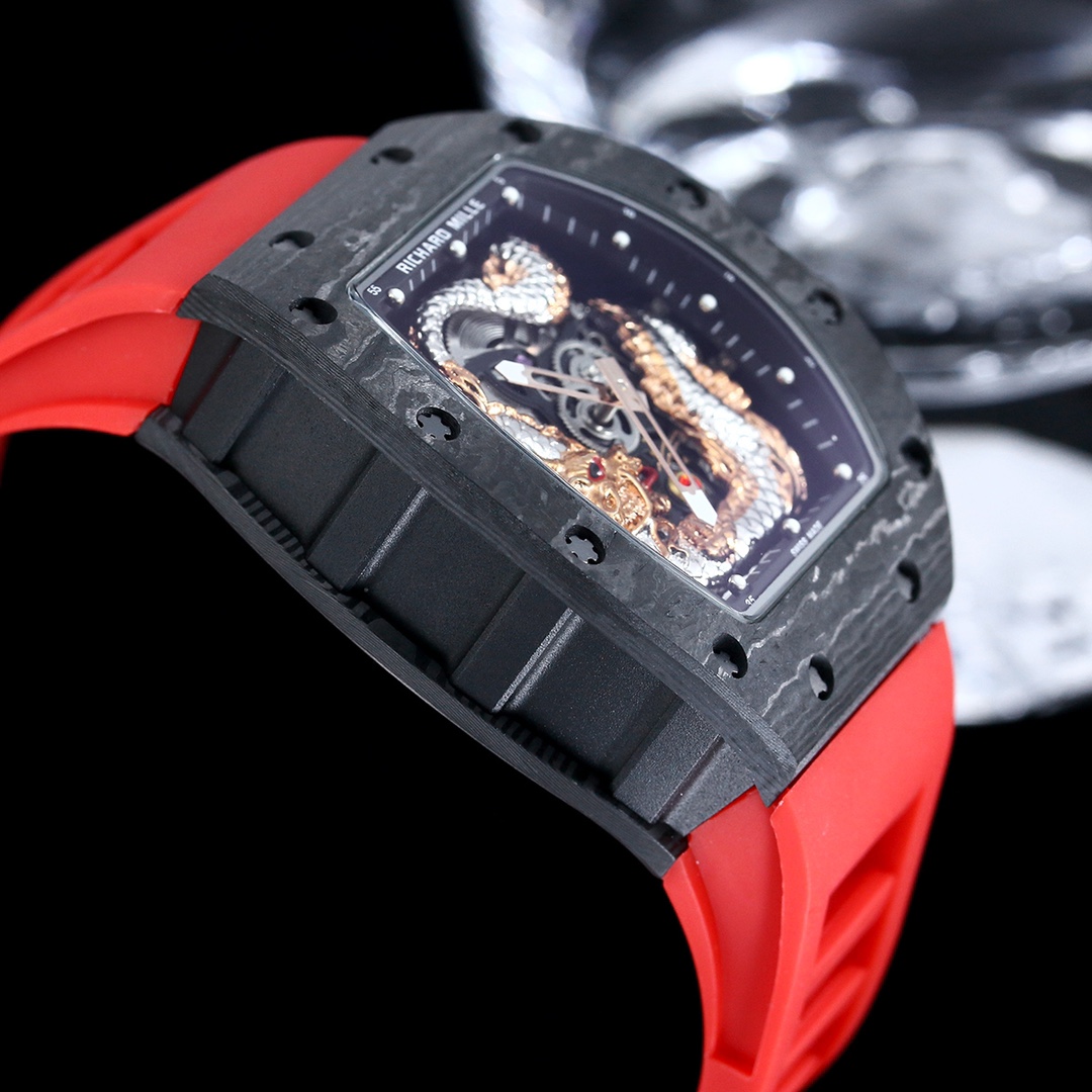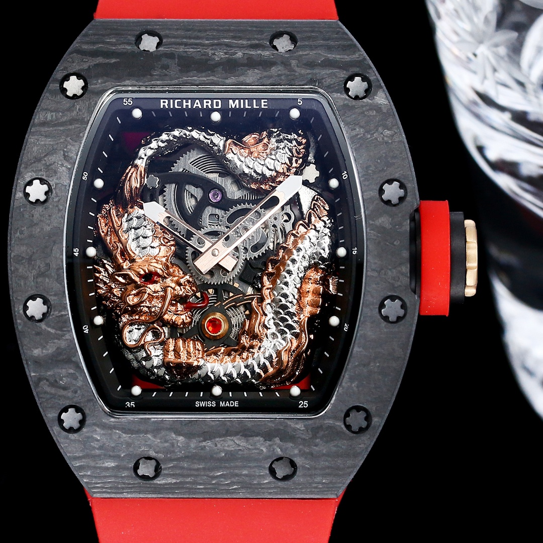 Swiss Replica Richard Mille RM 57-03 Dragon Skeleton Dial, Carbon Fiber Case, Red Rubber Strap Luxury Watch