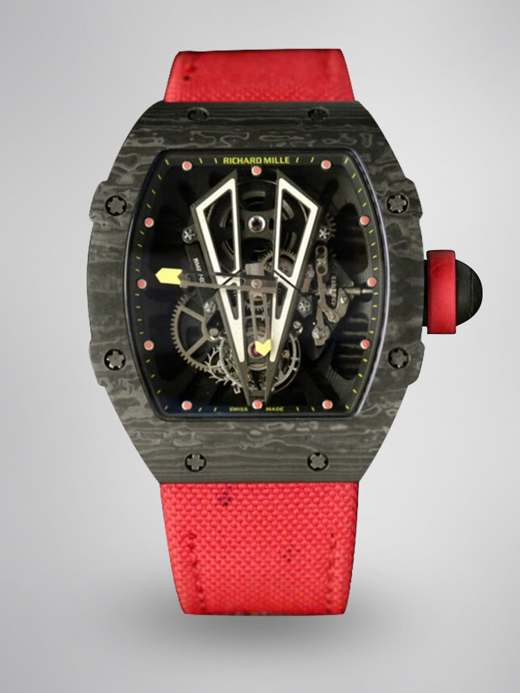 The Swiss Replica Richard Mille RM27-03 is a watch that blends bold design with great craftsmanship. It has a carbon fiber case and a bright red woven strap. The watch weighs only 43.5 grams, making it light and comfortable. The skeletonized dial is inspired by the Spanish Matador and shows a striking bullhead design. Its rubber-woven strap adds both comfort and style. This watch is a great choice for anyone who values modern design and top performance.