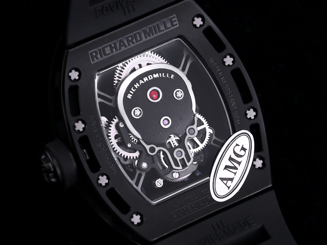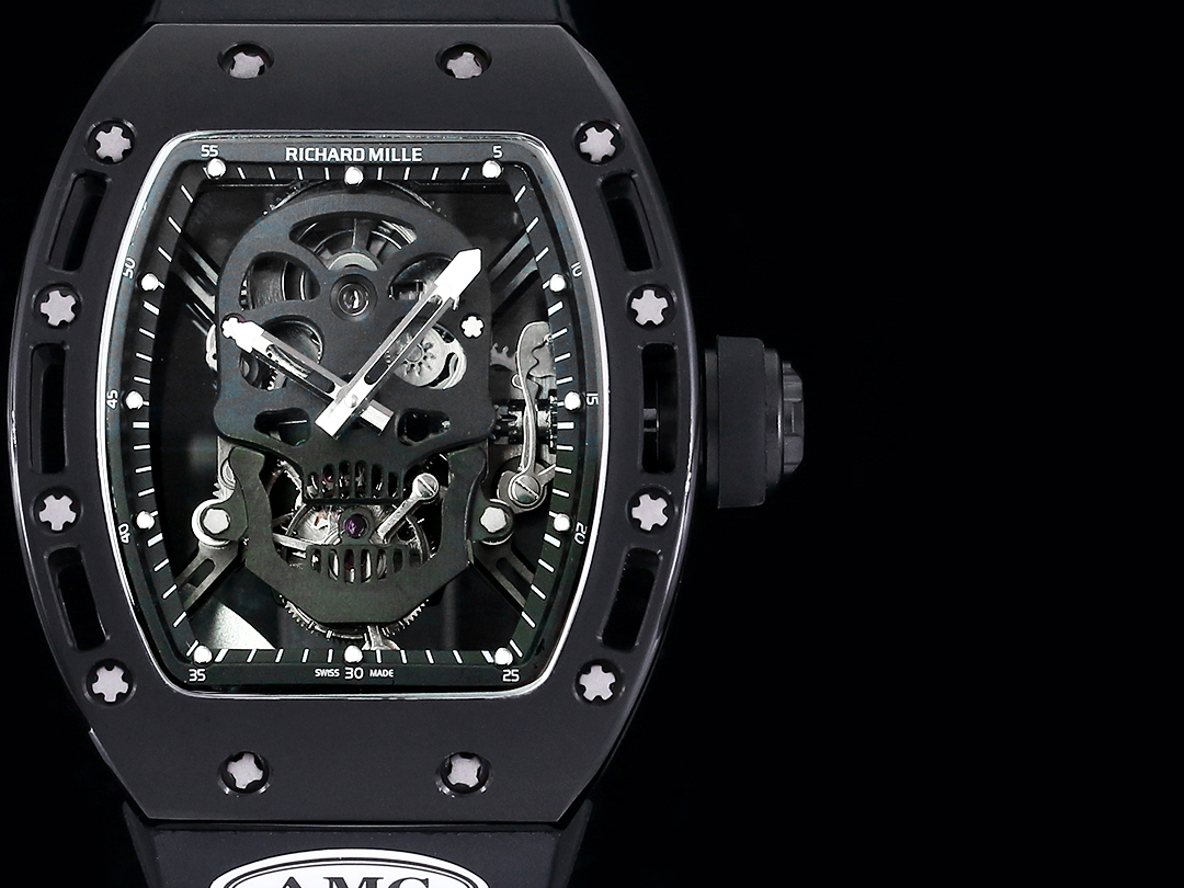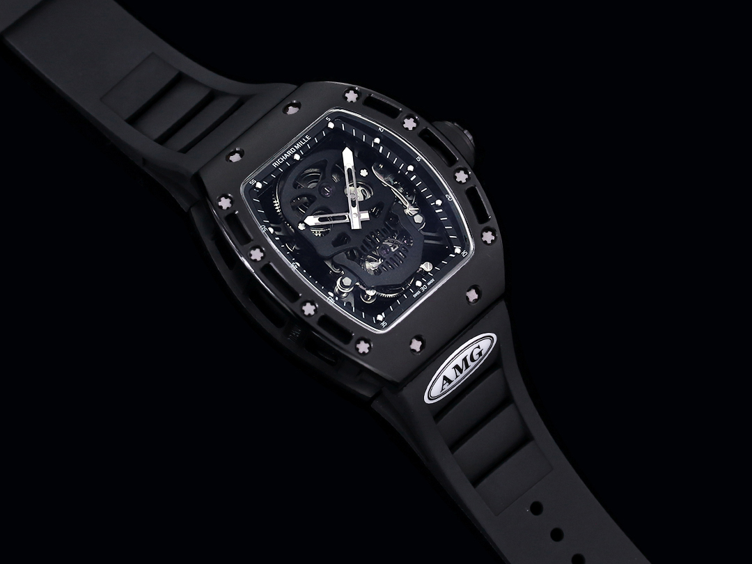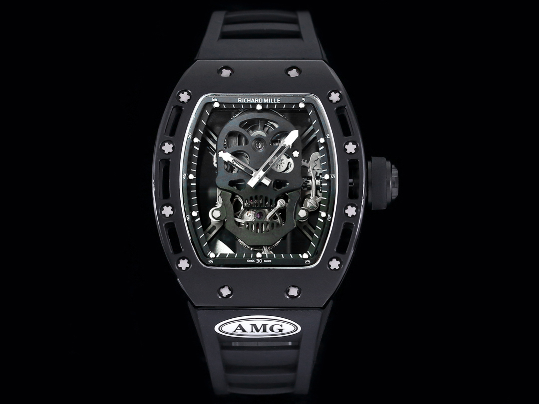 The Richard Mille RM 052 Replica where aggressive design meets high-end performance. Featuring a skeleton tourbillon dial with a bold skull design, this watch brings serious attitude to your wrist. The 43mm black stainless steel case and black rubber strap give it a stealthy, modern look.