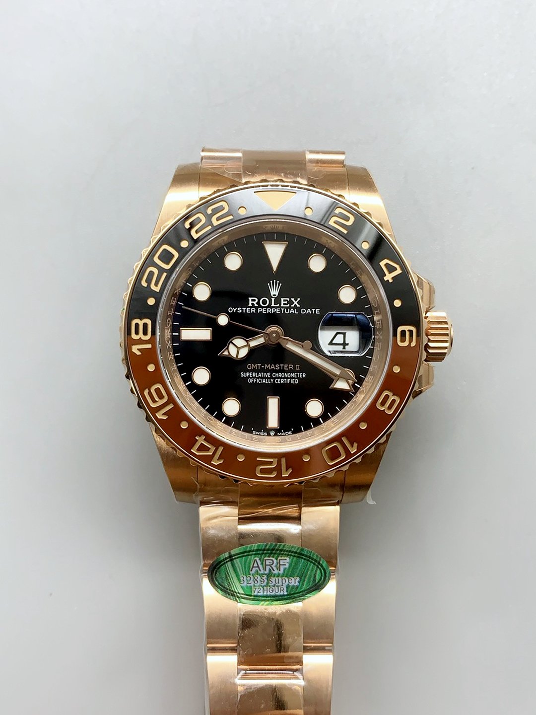 The New Rolex GMT-Master II in Rose Gold.() — Premium 1:1 super clone. Case: 904L stainless steel case and bracelet.. Crystal: Genuine sapphire crystal with AR coating.. Movement: Clone Cal. 3235 (28,800 bph, 70hr power reserve, date).. Price: $1650. 12-month movement warranty. Free worldwide shipping on orders over $1,200.