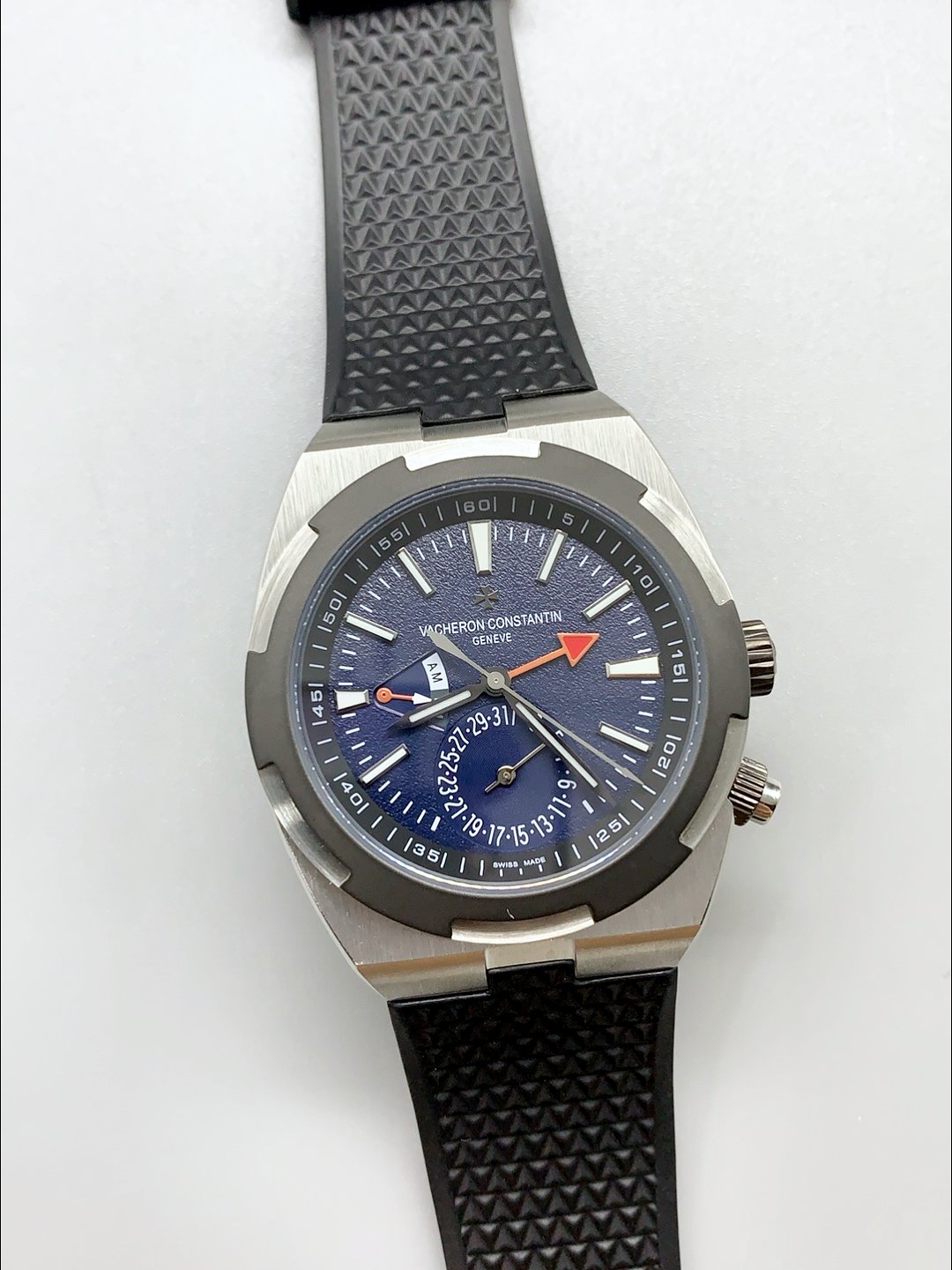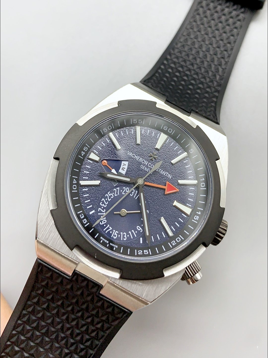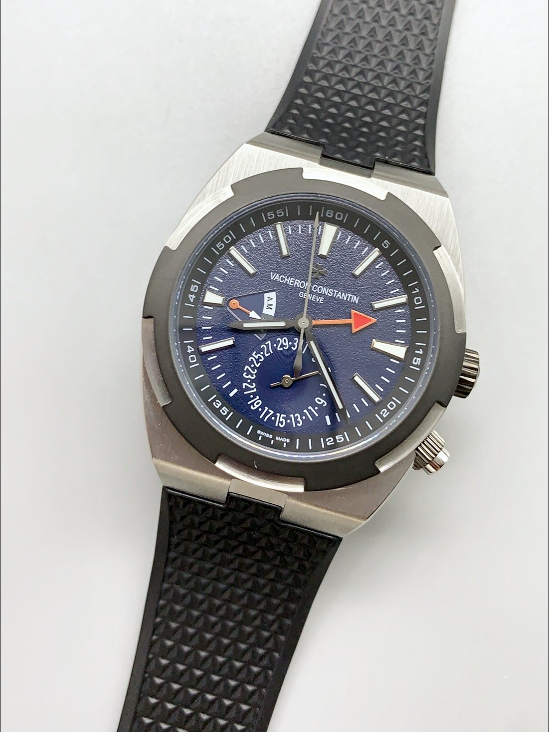 Vacheron Constantin Overseas Dual Time Titanium Watch in Blue Dial() — Premium 1:1 super clone. Case: 904L stainless steel or 18k gold case. Crystal: Genuine sapphire crystal with AR coating. Movement: Clone Cal. 5100 (28,800 bph, date). Price: $1,650. 12-month movement warranty. Free worldwide shipping on orders over $1,200.